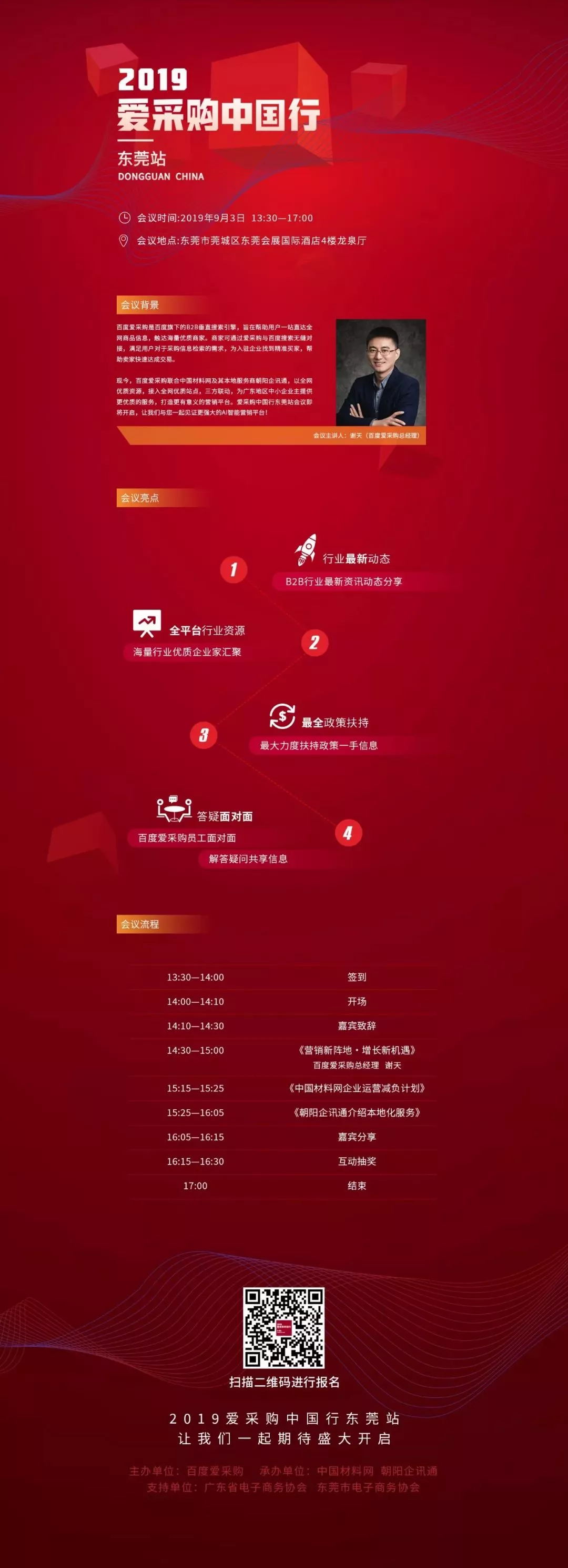 百度愛采購攜手朝陽企訊通共舉東莞盛會,手機端將成企業掌握關鍵2019年9月3日,百度愛采購將聯合朝陽企訊通、中國材料網,在東莞會展國際酒店舉辦行業峰會,屆時將由百度愛采購總經理謝天給大家分享新的機遇,還有幸邀請廣東商會和東莞商會、中國材料網和朝陽企訊通的主要負責人到場。9月3日,百度愛采購將聯合朝陽企訊通、中國材料網,在東莞會展國際酒店舉辦行業峰會,屆時將由百度愛采購總經理謝天給大家分享新的機遇,還有幸邀請廣東商會和東莞商會、中國材料網和朝陽企訊通的主要負責人到場。